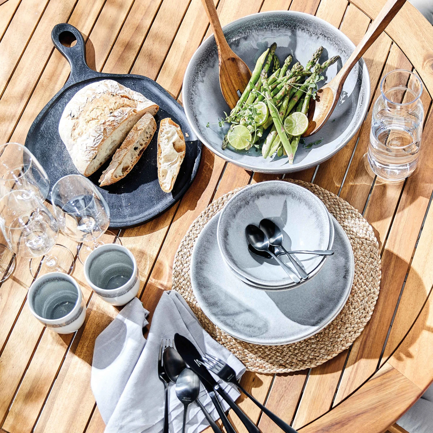 Mit unserer Geschirrserie Atlantis im angesagten Boho-Stil und organischen Formen kommt Extravaganz auf den gedeckten Tisch! Die Schale im 4er-Set aus Steinzeug ist handgefertigt in Portugal. Durch die reaktive Glasur entstehen unregelmäßige Farbverläufe, die jedes Teil der Serie zu einem echten Unikat werden lassen. Atlantis ist in verschiedenen Farben erhältlich, die Sie miteinander kombinieren können und so für Abwechslung auf Ihrem Tisch sorgen. Durch eine Iris-ähnliche Farbzentrierung passen alle Teile perfekt zusammen. Jedes Teil der Serie ist spülmaschinen- und mikrowellengeeignet.