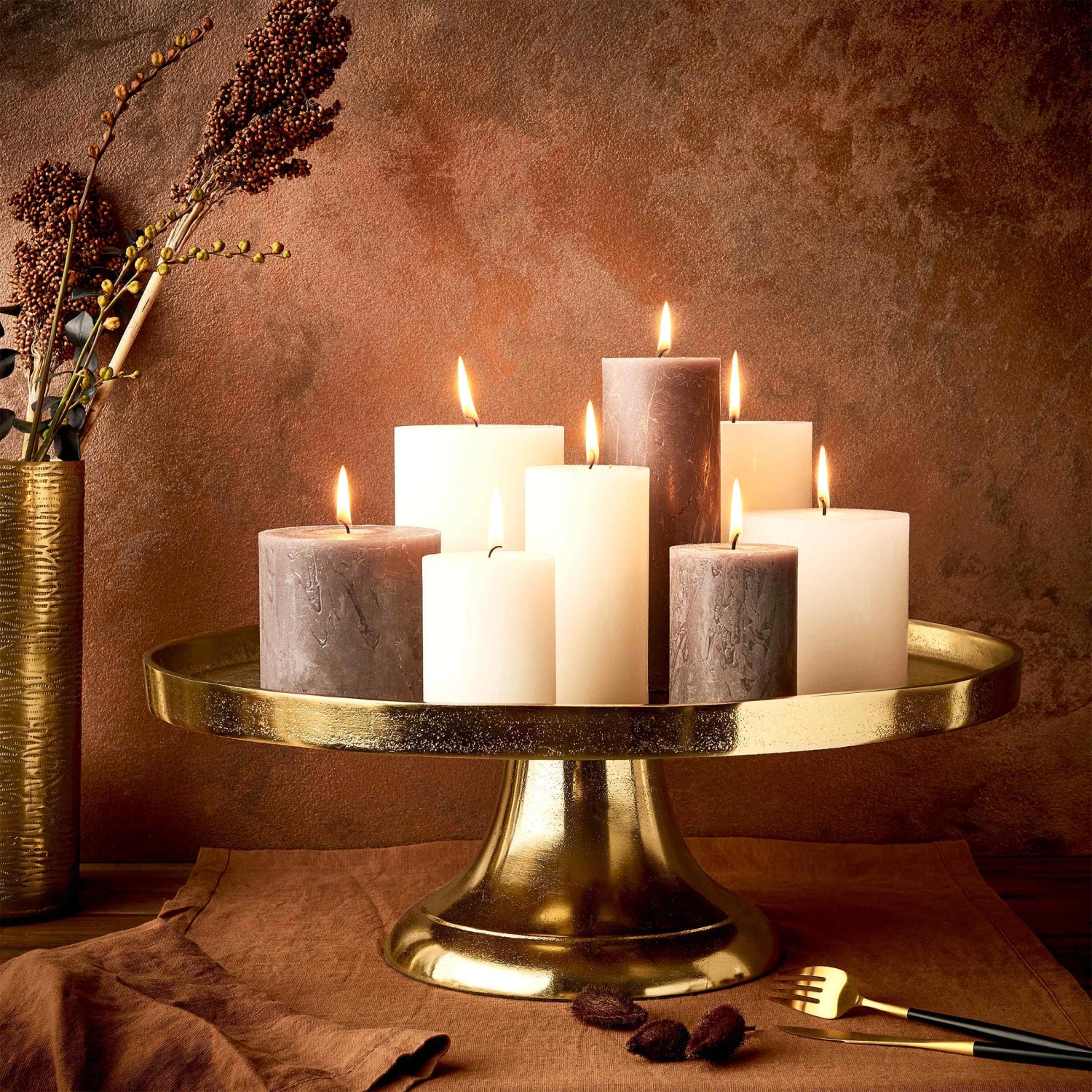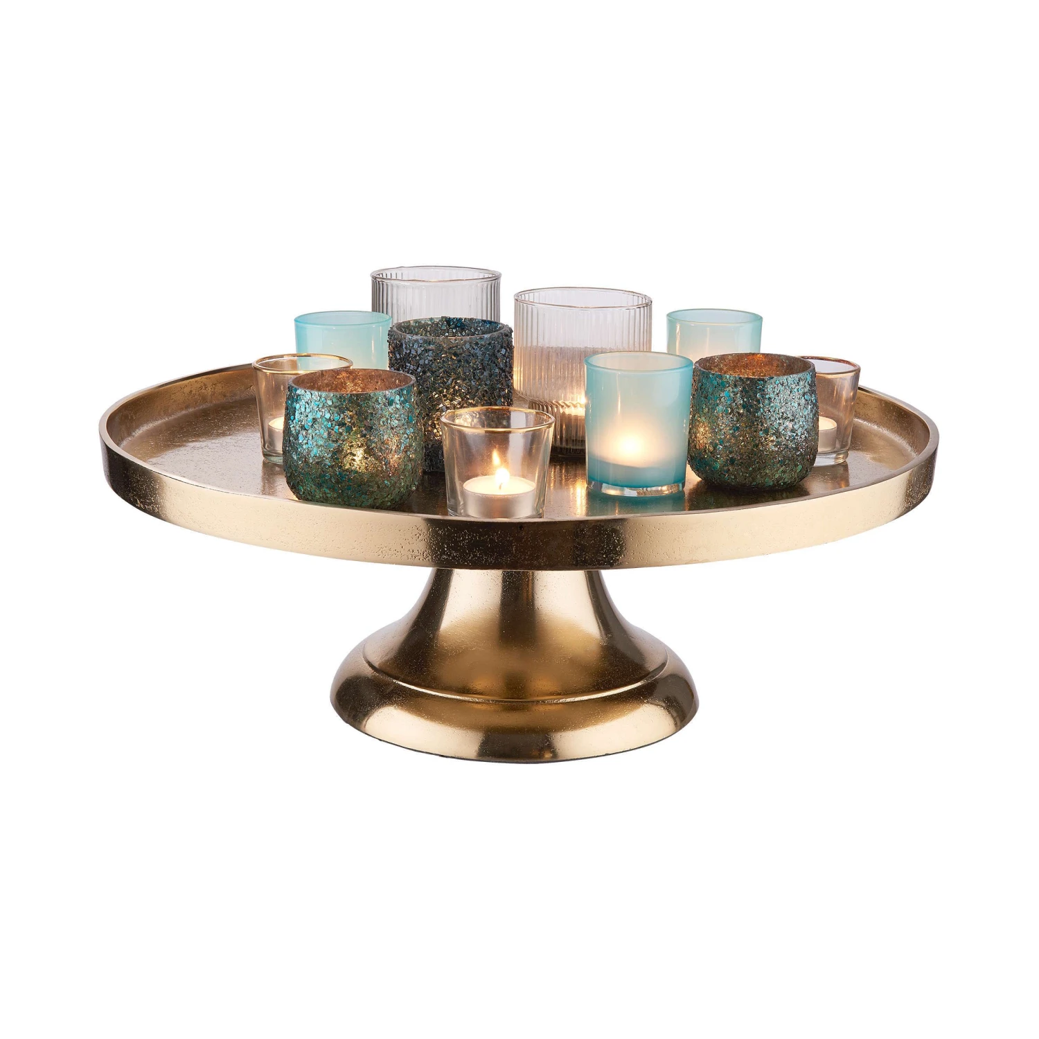 Gaaanz viele Teelichter finden funkelnd Platz auf dem prächtigen Banquet Deko Teller mit Fuß aus Aluminium in Gold. Oder Sie nutzen die 50 cm Durchmesser für Stumpenkerzen in unterschiedlichen Größen. Ob so oder so – auf Ihrem festlich gedeckten Tisch macht sich diese exklusive Deko auf jeden Fall glänzend.