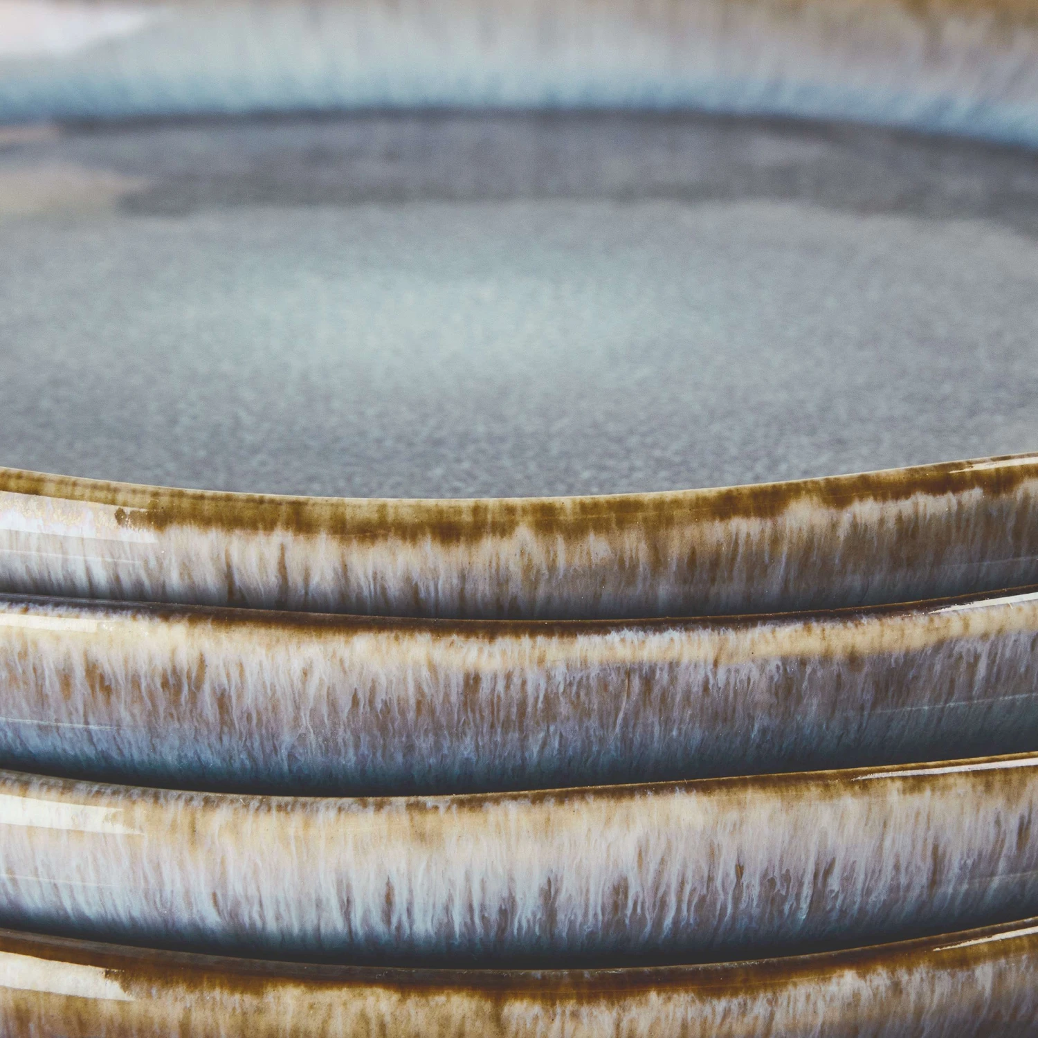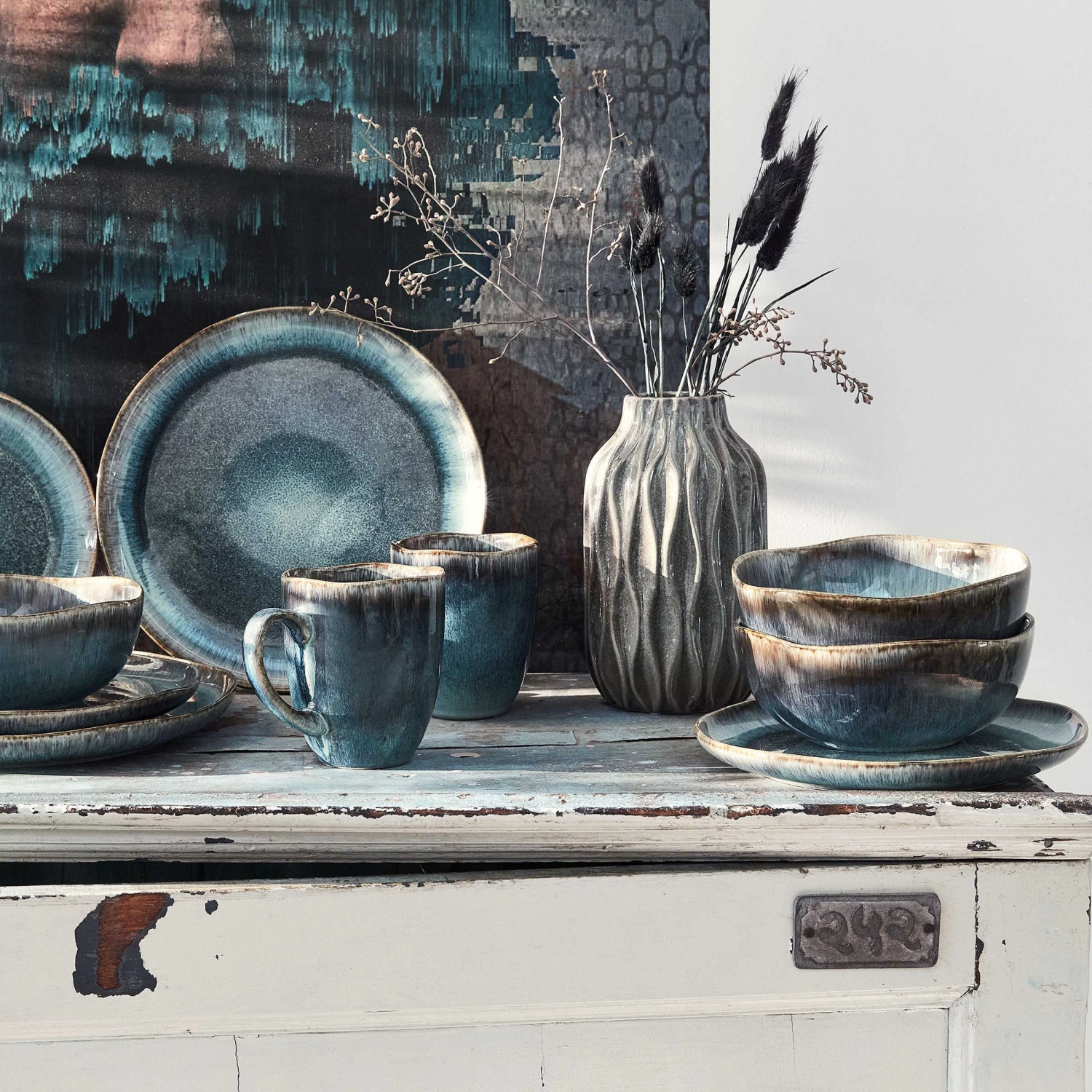 Wenn eine reaktive Glasur zum Kunstwerk wird: Am faszinierend schönen Hilda Geschirr Set 16-teilig können Sie sich gar nicht satt sehen. Die schimmernden Blautöne erinnern an nordische Fjorde und malerische Bergseen, und auch der organische Shape erzählt von Naturverbundenheit. Jedes Teil dieser einzigartigen Geschirrserie aus Steinzeug ist ein Einzelstück, und jeder mit Hilda Tellern, Schalen und Tassen gedeckter Tisch die reinste Augenweide.