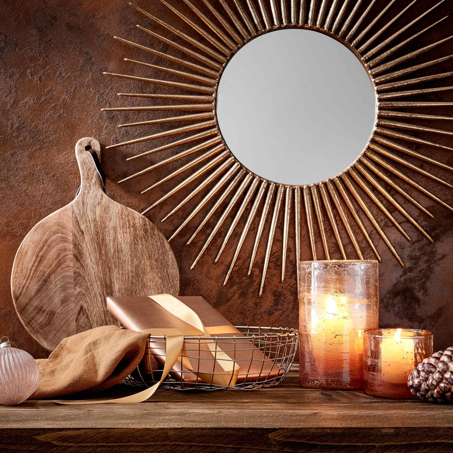 Ein dekoratives Trend-Piece für Ihre Zuhause: Der Del Sol Spiegel aus Glas lässt mit seinen Strahlen aus goldenem Eisen die Sonne in Ihrem Flur, Bad oder Wohnzimmer aufgehen. Zum besonderen Blickfang wird er dabei auf farbigen oder dunkeln Wänden, aber auch Pastell bringt den Wandspiegel schön zur Geltung.