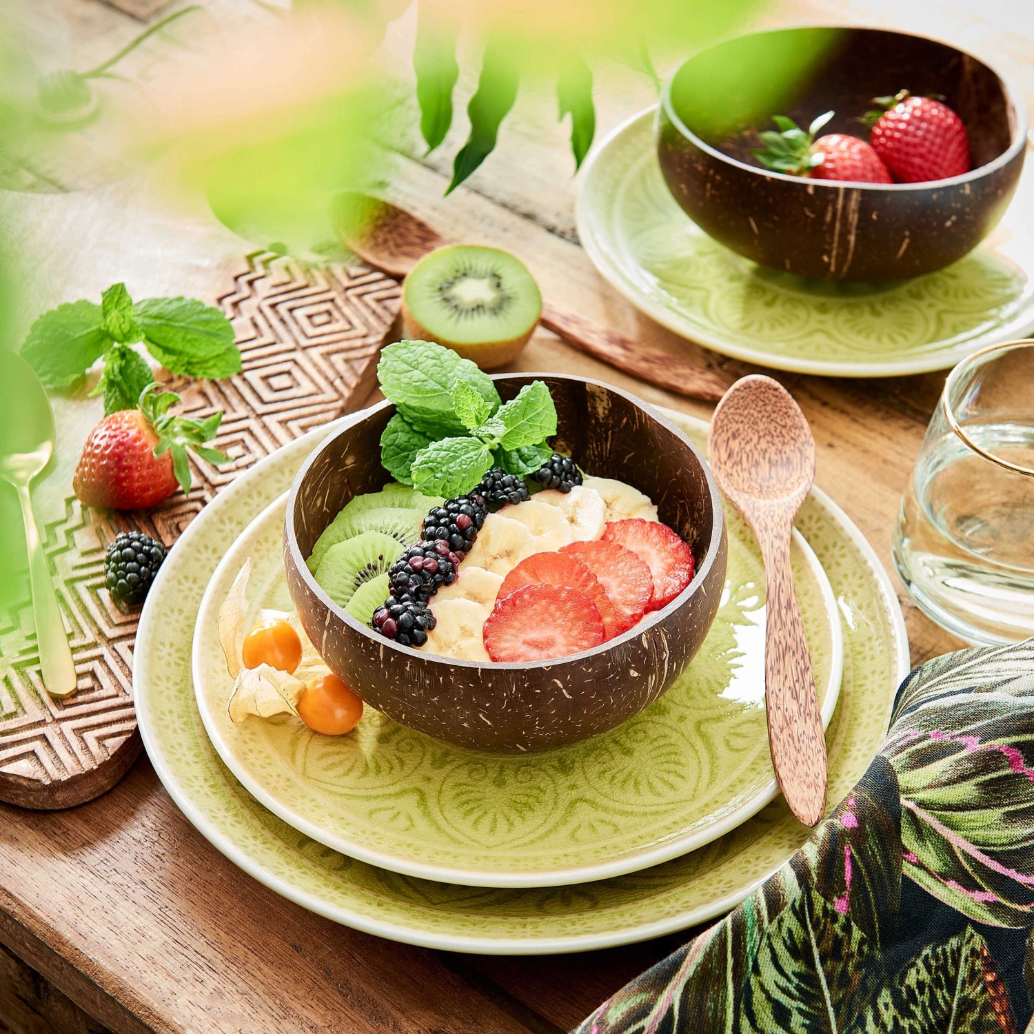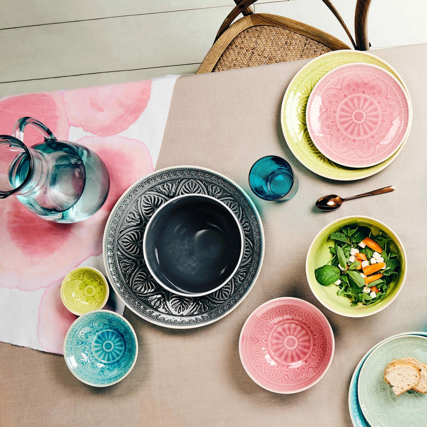 Der prächtige, asiatische Sumatra Teller mit einem Durchmesser von 25 cm und traditionellem Dekor mit effektvoll glänzender Glasur. Der große Speiseteller aus Steinzeug ist ein echter Blickfang auf Ihrem gedeckten Tisch. Die kostbare Optik des bunten Tellers bietet einen feinen Kontrast zu den sehr scharf gewürzten Speisen, die man traditionell auf der Insel Sumatra reicht.